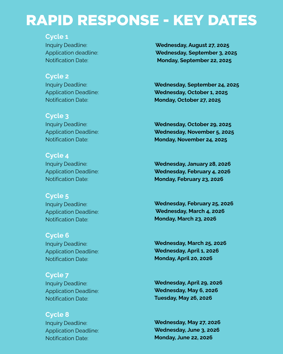 There are 8 rounds of Rapid Response grantmaking in the 2025-2026 fiscal year. We expect to distribute $600,000 in grants (approximately $75,000 per grant round). This application process is intended to facilitate fast decision making. If approved, organizations can expect to receive funding within 30 days of the application deadline for a given cycle.