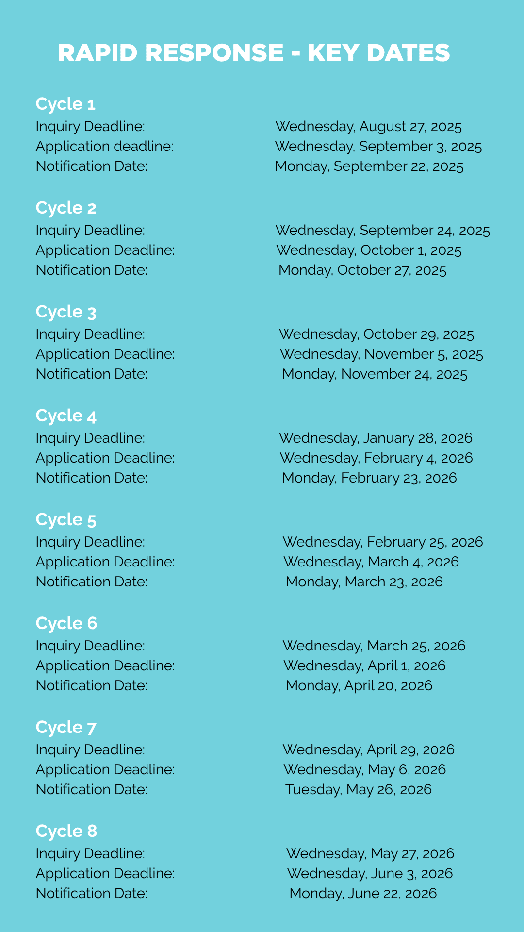 Cycle 1 Deadline To Submit An Inquiry For This Cycle Wednesday, August 27, 2025 Application Deadline Wednesday, September 3, 2025 Notification Date Monday, September 22, 2025 Cycle 2 Deadline To S